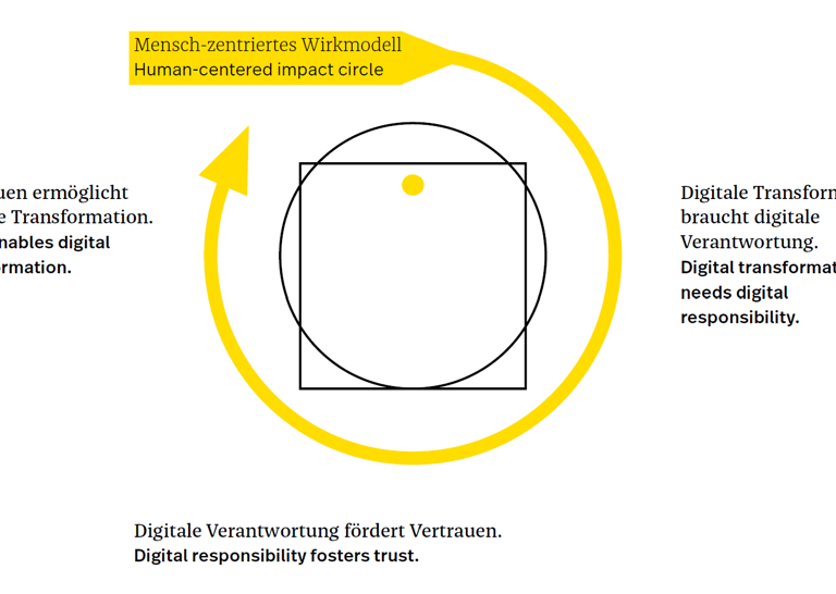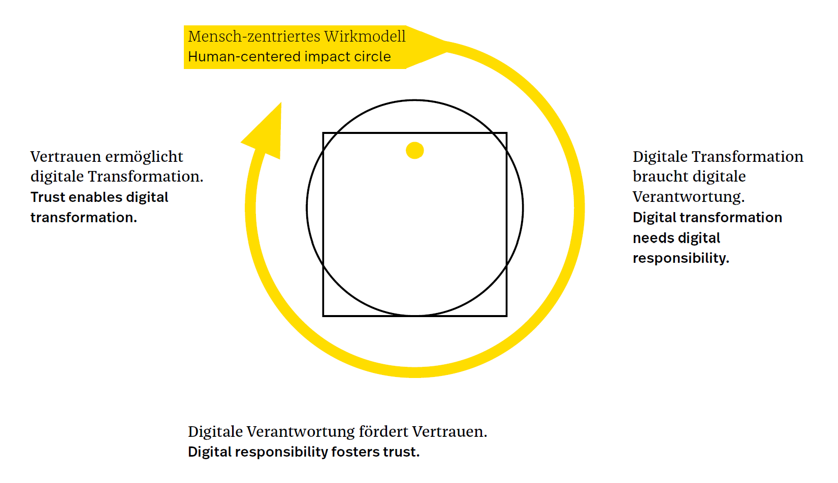 Im Prinzip sind die Digital Responsibility Goals die treibende Kraft für ein mensch- und planetenzentriertes Wirkungsmodell (siehe Abbildung unten): Die digitale Transformation, wie wir sie momentan erleben, ist nicht nachhaltig. Es mangelt an digitaler Verantwortung, um notwendiges Vertrauen aufzubauen.